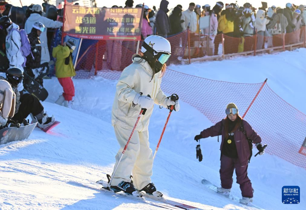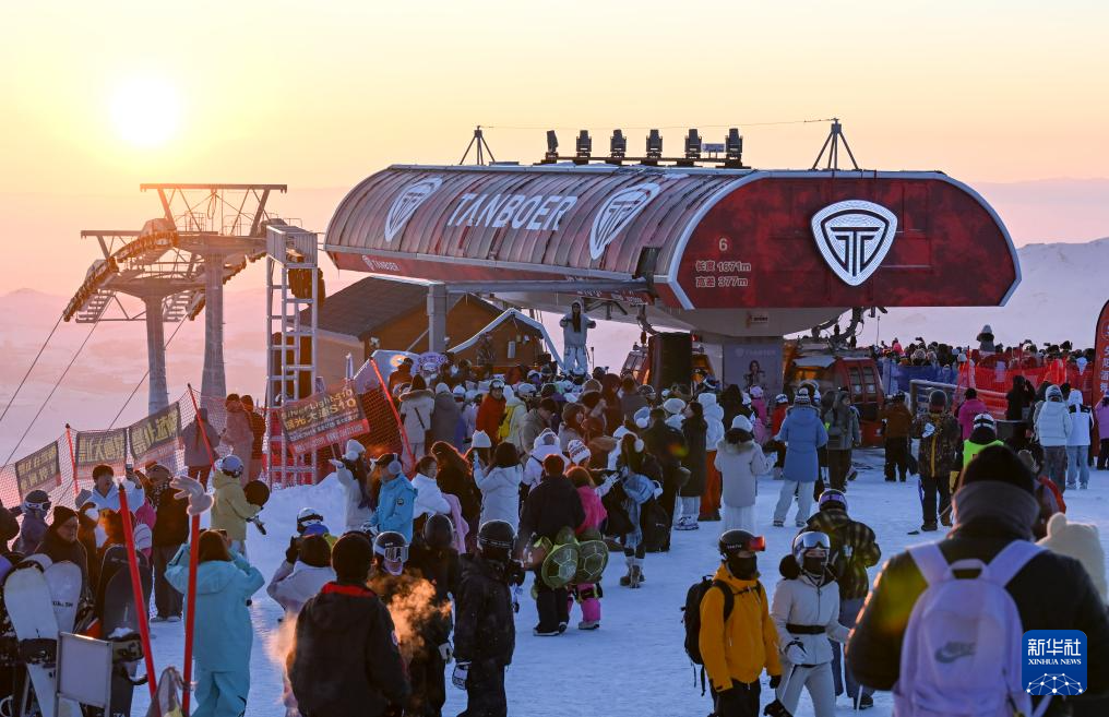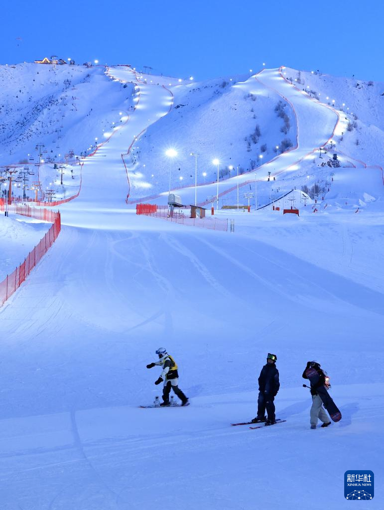 2月25日,滑雪爱好者在新疆阿勒泰将军山国际滑雪度假区参加“夕阳派对”。