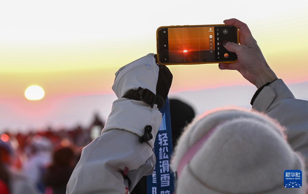 2月25日,滑雪爱好者在新疆阿勒泰将军山国际滑雪度假区拍摄夕阳。