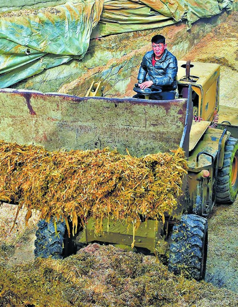 26日,卡吾力江·塔依尔驾驶铲车装运饲料。