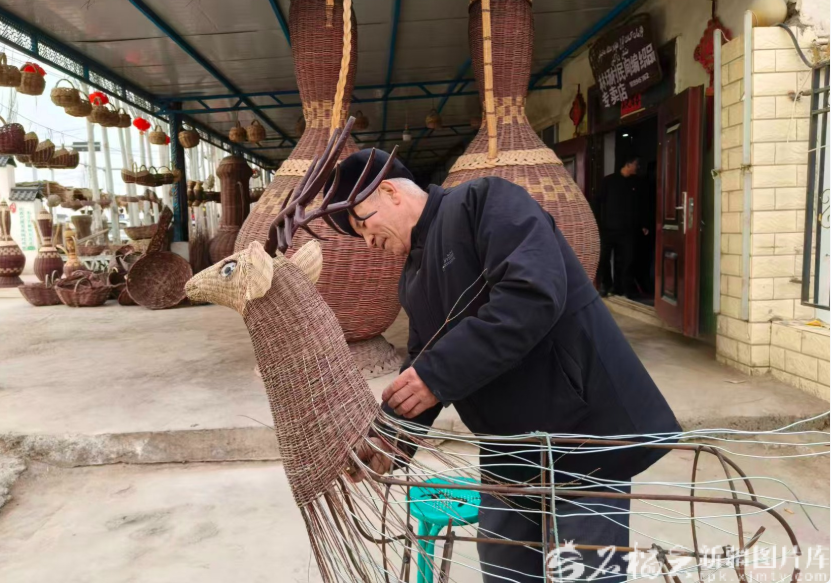 库车市比西巴格乡林场村柳编手艺人在用红柳条编织鹿的造型。天山网-新疆日报记者 张治立摄