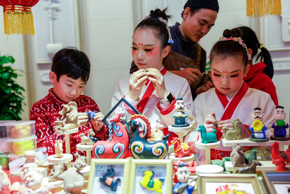 在乌鲁木齐市天山区级非遗代表性项目泥彩塑的展位前,乌鲁木齐市第三十四小学的学生张语诺在非遗传承人张江豪的引导下捏制泥彩塑,一块长方体的软泥逐渐变成了马的形状。不一会儿,该展位就接待了20多位参加体验的学生。“我制作泥彩塑已经有4年了,在乌鲁木齐市区有一处工作室,目前已指导研学学生超千人。”张江豪说。在新疆维吾尔自治区级非遗代表性项目掐丝珐琅画的展位前,2位学生描绘着掐丝珐琅画的底板,再用镶嵌金属丝制作掐丝珐琅画。该项目市级代表性传承人李华说:“春节期间,我们在新疆非遗馆内持续开展非遗体验活动,进一步扩大掐丝珐琅技艺的知名度和影响力。”
