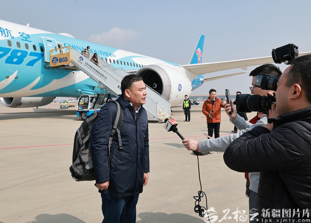 3月3日,出席十四届全国人大四次会议的在疆全国人大代表乘机抵达北京。图为库尔班·尼亚孜代表接受媒体采访。天山网-新疆日报记者 崔志坚摄