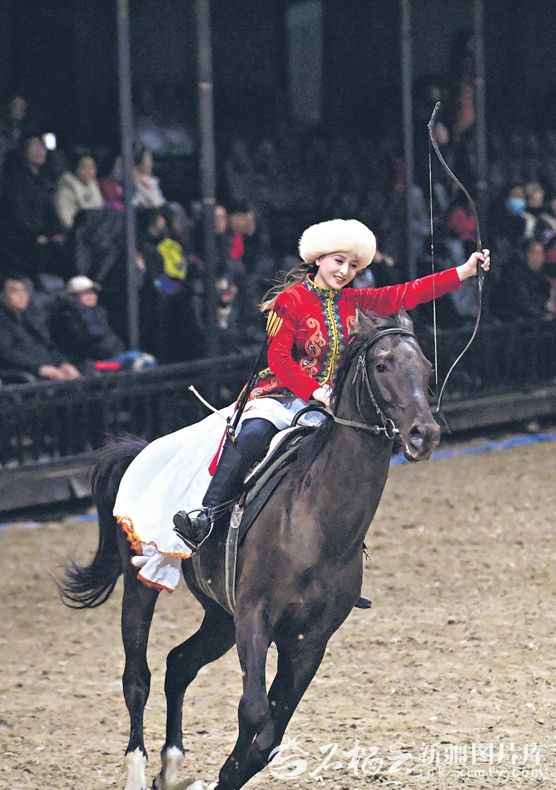 3月10日,新疆古生态园汗血马基地里马蹄声阵阵。骑手布阿依夏木·吐尔洪稳坐马背,拉弓、放箭,动作行云流水、一气呵成,赢得现场观众阵阵掌声。