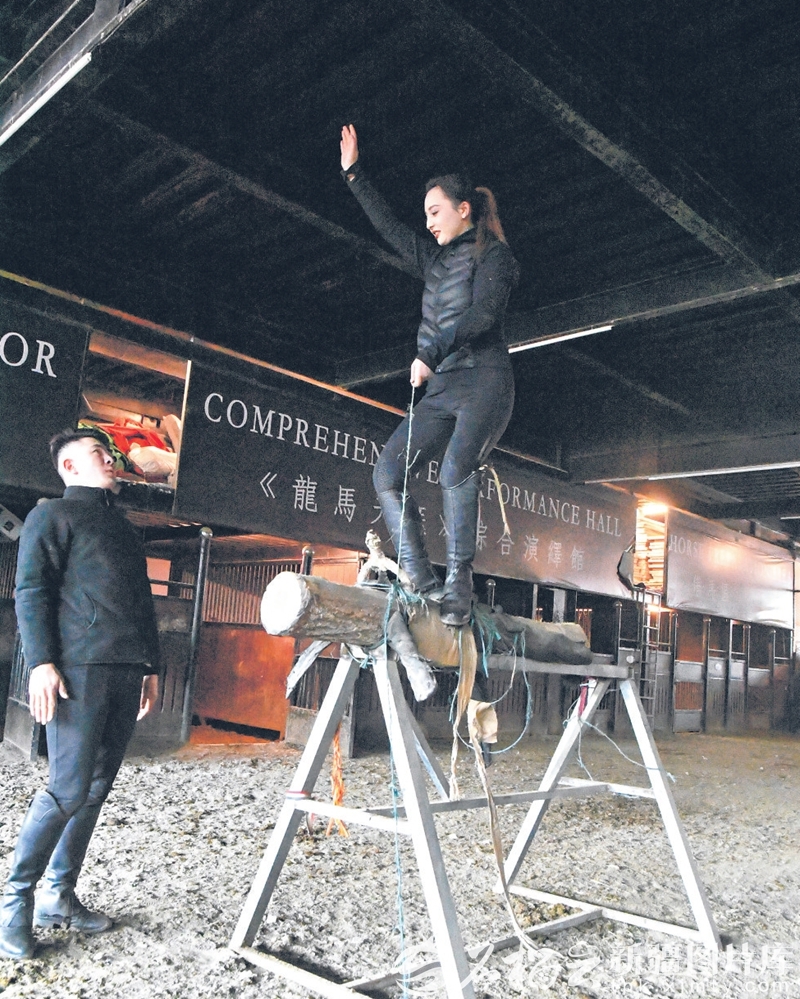 3月10日,布阿依夏木在同事的帮助下做马背技巧练习。