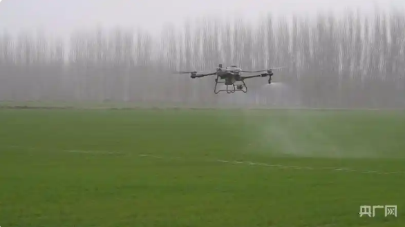 植保无人机正在阿克苏市麦田上空开展飞防作业 (央广网发 热普亥提·阿不力米提 摄)
