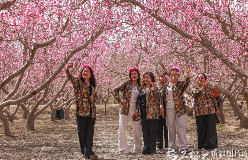 和田县拉依喀乡桃花源村万亩桃园,头戴花环的女士在花林间举着手机定格春光。许晓龙摄