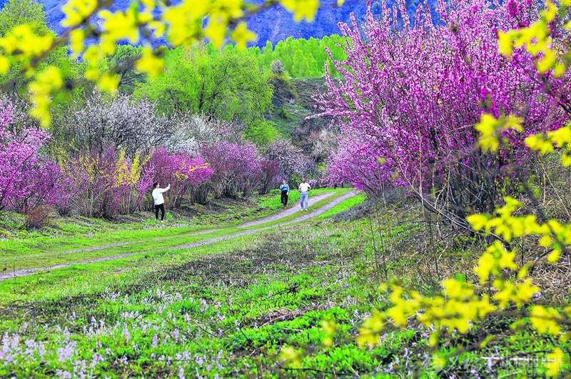 4月9日,游客在新源县阿勒玛勒镇伊犁植物园游玩。眼下,伊犁河谷万物复苏,园内杏花盛放,樱桃李、新梅等树木繁花满枝,各色花卉交织成绚烂花海,景色浪漫而唯美。张文庭摄