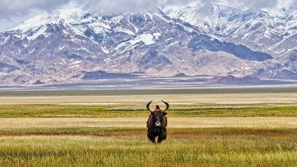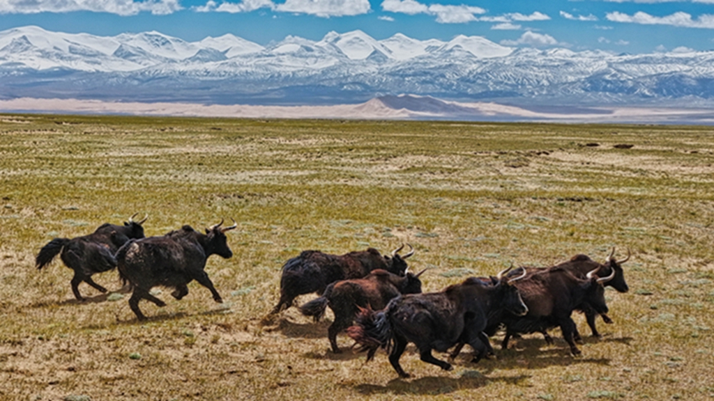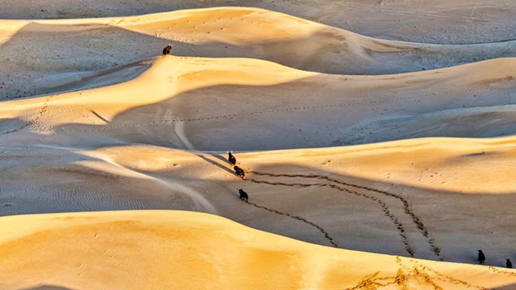 更令人震撼的是,体重逾吨的“高原坦克”野牦牛成群结队翻越沙丘,踏过金色沙脊,它们身后是连绵不绝的雪峰天际线。