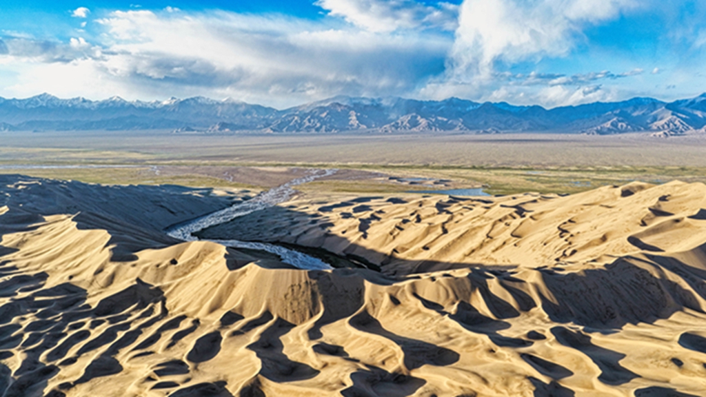 山脉南侧,横亘着世界上海拔最高的库木库里沙漠。这片沙漠面积达1600平方公里,海拔在3916米至4706米之间。登高远望,金色沙丘连绵起伏,与远处皑皑雪峰相映成趣;沙漠腹地泉眼密布、湖泊点缀,沙、水、草原、雪山共生共存,构成生态奇观。