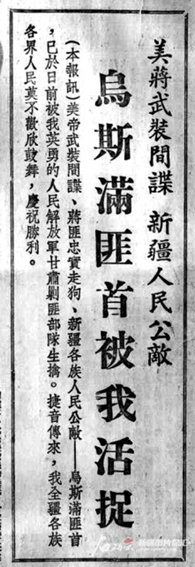 一九五一年二月二十一日,新疆日报在头版报道乌斯满被活捉的消息。
