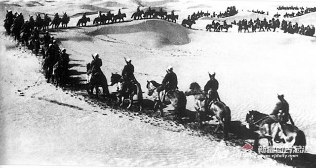 在缺粮、断水的情况下,剿匪部队在古尔班通古特沙漠追击叛匪。